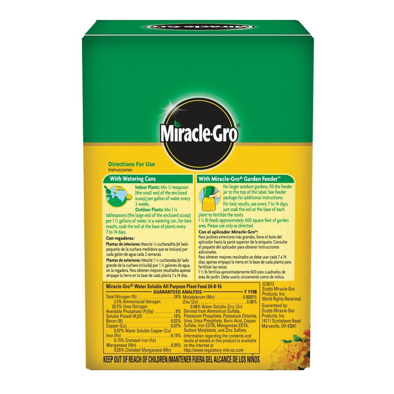 Miracle-Gro water soluble all purpose plant food instantly feeds vegetables, trees, shrubs and houseplants to grow bigger and more beautiful than unfed plants. Simply feed them every 1-2 weeks. The formula is safe for all plants and is guaranteed not to burn when used as directed. Get beautiful results with Miracle-Gro.