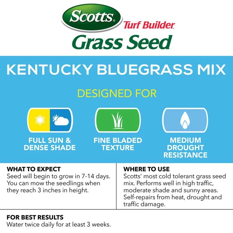 Scotts Turf Builder Grass Seed Kentucky Bluegrass Mix is a unique mix that performs well in high-traffic areas, under moderate shade and in sunny areas. As Scotts most cold-tolerant grass seed mix, it has the ability to self-repair from heat, drought and high-traffic damage. And, each seed is wrapped in a unique 4 in 1 WaterSmart Plus Coating that absorbs 2x more water than uncoated seed, feeds with essential nutrients and helps protect seedlings from disease.