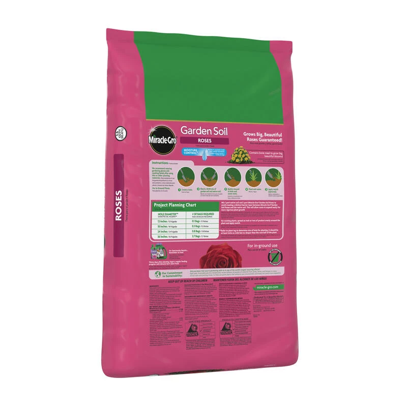 Ready to grow bigger, more beautiful roses Trust Miracle-Gro Garden Soil Roses. Enriched with our continuous release plant food, this soil will feed for up to 3 months. Meanwhile, Moisture Control technology protects plants against over- and under-watering. Get more blooms and more color with Miracle-Gro. vs. unfed plants.
