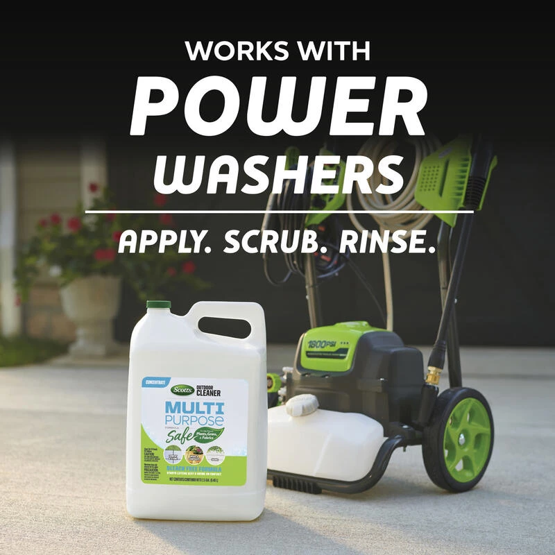 Forget filling your shelves with an individual deck cleaner, siding cleaner, brick cleaner and patio furniture cleaner. Scotts Outdoor Cleaner Multi-Purpose Formula is your everyday go-to for tackling a weekendโs worth of dirty jobs (and then some, thanks to the concentrated formula). Patio furniture on deck, Check. Siding, Check. Roof shingles, Check. Even your boat interior, Check, mate. From cement and stone to wood and composite, the fast-foaming action of this multipurpose cleaner lifts dirt and grime on contact. Designed with the environment in mind, the bleach-free formula delivers the punch you expect from a cleaner while still being safe to spray and use around plants, grasses and on outdoor fabrics such as umbrellas, awnings and more. Depending on your cleaning needs, first, dilute the concentrate according to the table on the label. Next, simply apply the cleaner onto surfaces using a bucket, tank sprayer or power washer. Let it sit for 5-10 minutes. Scrub, rinse and move onto the next project on your list.