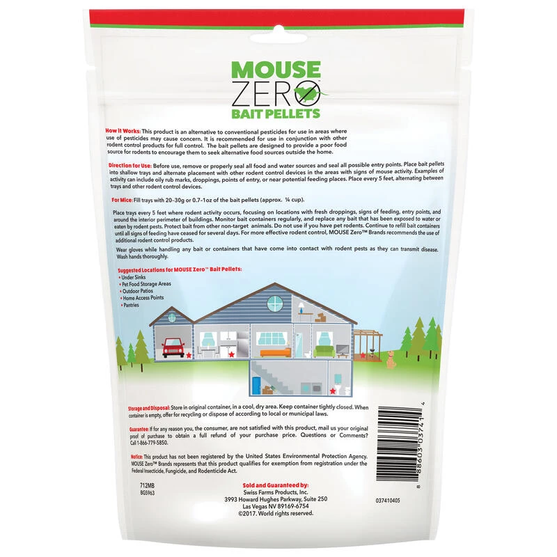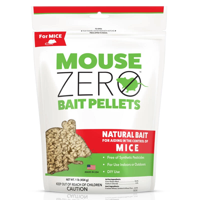MOUSE Zero Bait Pellets offer a natural solution for aiding in the control of mice. Free of synthetic pesticides, they are an alternative treatment to conventional pesticides. The convenient, bait pellet form may be used both indoors and outdoors for DIY control.