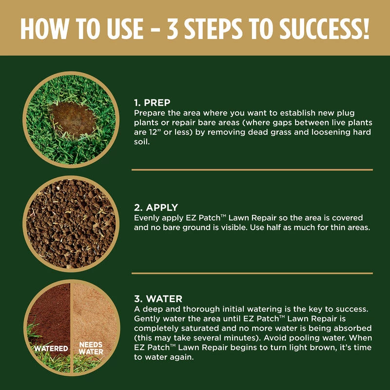Scotts EZ Patch Lawn Repair for St. Augustine Lawns offers a brand new way to repair bare spots in your St. Augustinegrass lawns. With its unique blend of super-absorbent mulch and controlled release fertilizer technology, you can repair your bare spots 60% faster (Results 15 days after application vs. untreated control. Results may vary). Scotts EZ Patch Lawn Repair also works great with plugs. Please note, this product Does Not contain seed.