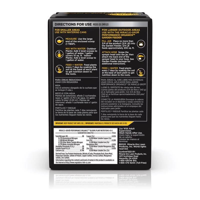 Miracle-Gro Performance Organics Blooms Plant Nutrition is specifically formulated with key nutrients for flowering plants. This OMRI listed plant food instantly feeds flowers in ground and in containers. Apply every 7 days using a watering can or a Miracle-Gro Performance Organics Garden Feeder. This season, enjoy more blooms for vibrant color (vs unfed potted plants) with Miracle-Gro Performance Organics Blooms Plant Nutrition.