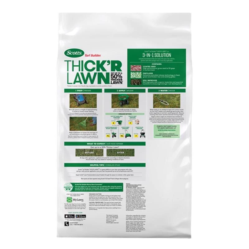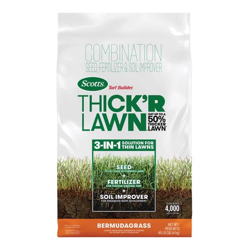 The 3-in-1 solution contains seeds to fill gaps in the current lawn, fertilizer for a thicker, greener turf and a soil improver for enhanced root development. Apply to a Bermudagrass lawn in late spring or early summer using a Scotts broadcast, rotary, drop, Elite, hand-held or Wizz spreader. Scotts Turf Builder Thick’R Lawn Bermudagrass is uniquely formulated to help turn weak, thin Bermudagrass into a thicker, greener lawn with stronger roots in one application.
